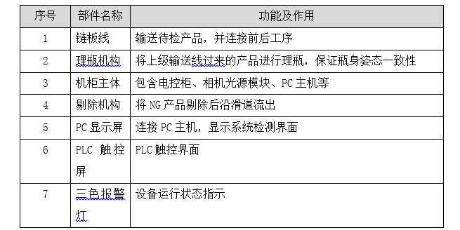 “上工序来料”→“理瓶机构调整瓶身姿态”→“来料倒瓶检测”→“视觉检测并输出信号”→“NG品剔除”→“OK品流入下一工序”
